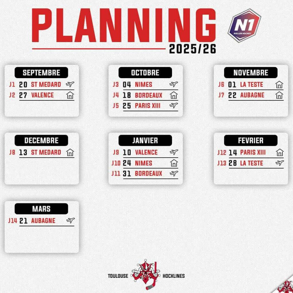 Calendrier de la saison 2025-26 > Actualités du club > Nationale 1 > Calendrier de la saison 2025-26 Nationale 1 21 septembre 2025 Si vous voulez d'ores et déjà prendre date, voici les échéances de notre équipe N1 sur la phase régulière de championnat. Partager Catégories Événements Féminines Informations Nos adhérents ont du talent Jeunesse Loisirs Nationale 1 Nationale 2 Nationale 3 Nationale 4 Non classé Partenaires Patinage Résultats Stages Dernières actus 21 septembre 2025 Calendrier de la saison 2025-26 Nationale 3 21 septembre 2025 Calendrier de la saison 2025-26 Nationale 1 24 juin 2025 Romuald, un pilier du club qui tourne une page Événements Informations Jeunesse Nationale 1